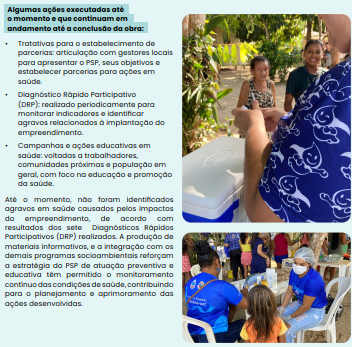Acompanha as condições sociais de comunidades vulneráveis próximas à obra, propondo ações de mitigação.