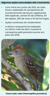 Estuda a fauna local antes, durante e após a obra, avaliando os impactos e orientando medidas de proteção.
